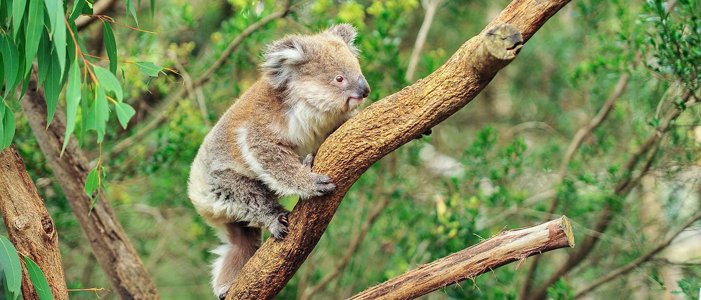 Koala's are also marsupials and are "cousins" to the kangaroo. A newborn koala is only the size of a jelly bean when born. Called a joey, the baby is blind, naked, and earless. This tiny creature makes its way from the birth canal to its mother's pouch all by itself. Koalas typically inhabit open wooded areas, and the leaves of the eucalypt trees make up most of their diet. Because this diet has limited nutritional and caloric content, koalas are largely sedentary and sleep up to 20 hours a day...much like teenagers!